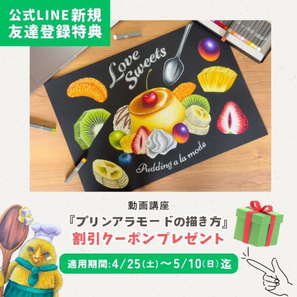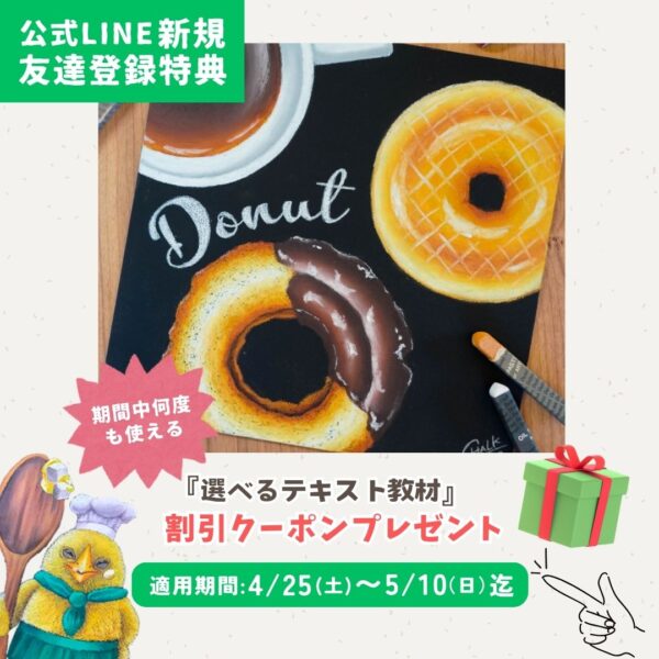 キャンペーン キャンペーン 【期間限定】2026 春のSTUDYキャンペーン 2026年4月25日 チョークトリオ Facebook Twitter はてブ Pocket Feedly 2026年4/25(土)~5/2(土)までの期間中 チョークトリオの公式LINEに新規お友達登録してくれた方に 『プリンアラモード描き方動画3本セット』 『選べるチョークアートテキスト教材』 割引クーポンプレゼント! クーポン有効期限 2026年4/25(土)~5/10(日)まで お友達登録をしてチョークトリオの動画教材をお得に購入してみませんか! 動画教材についての詳細はこちら! テキスト教材についての詳細はこちら! スポンサーリンク